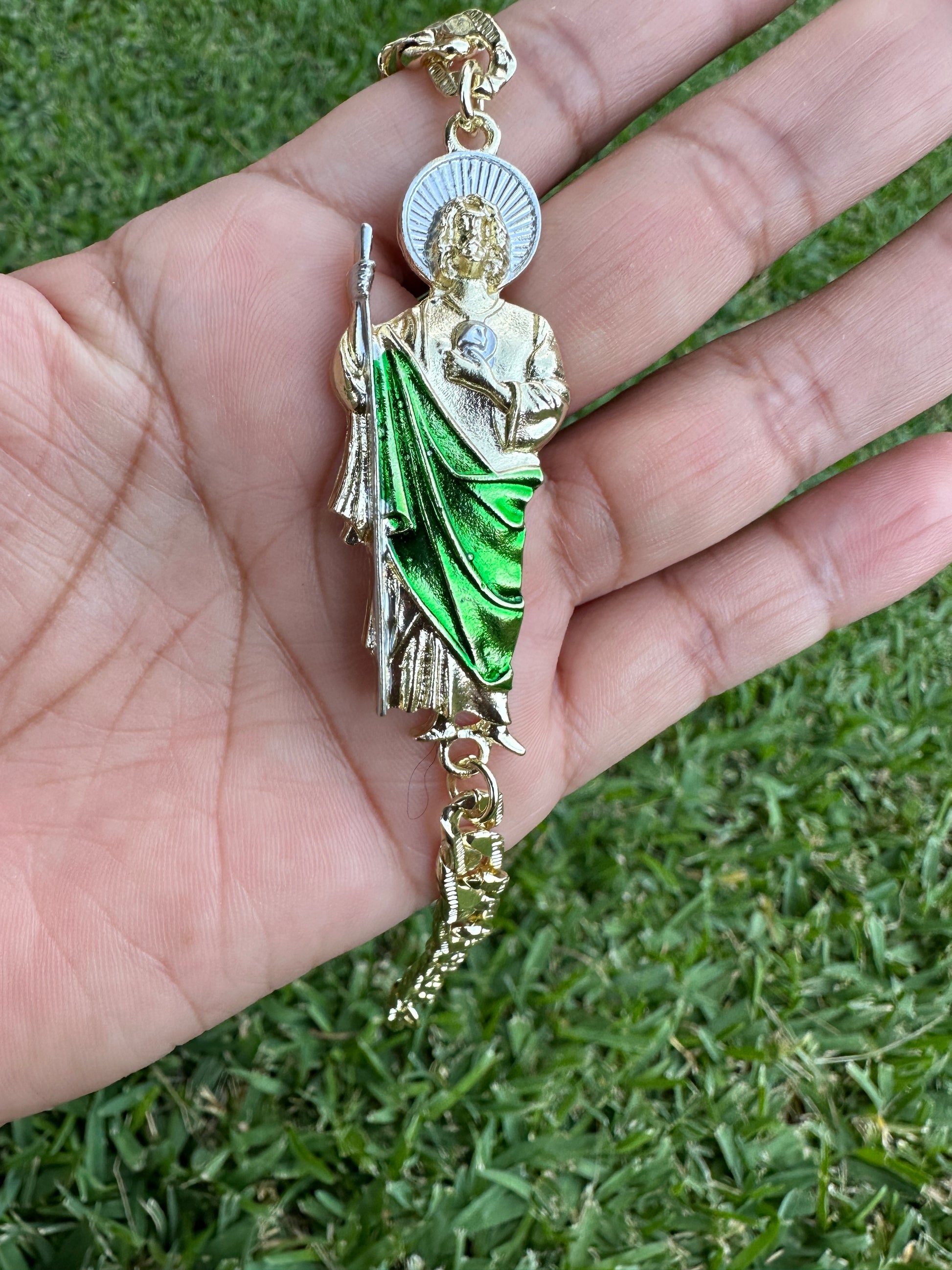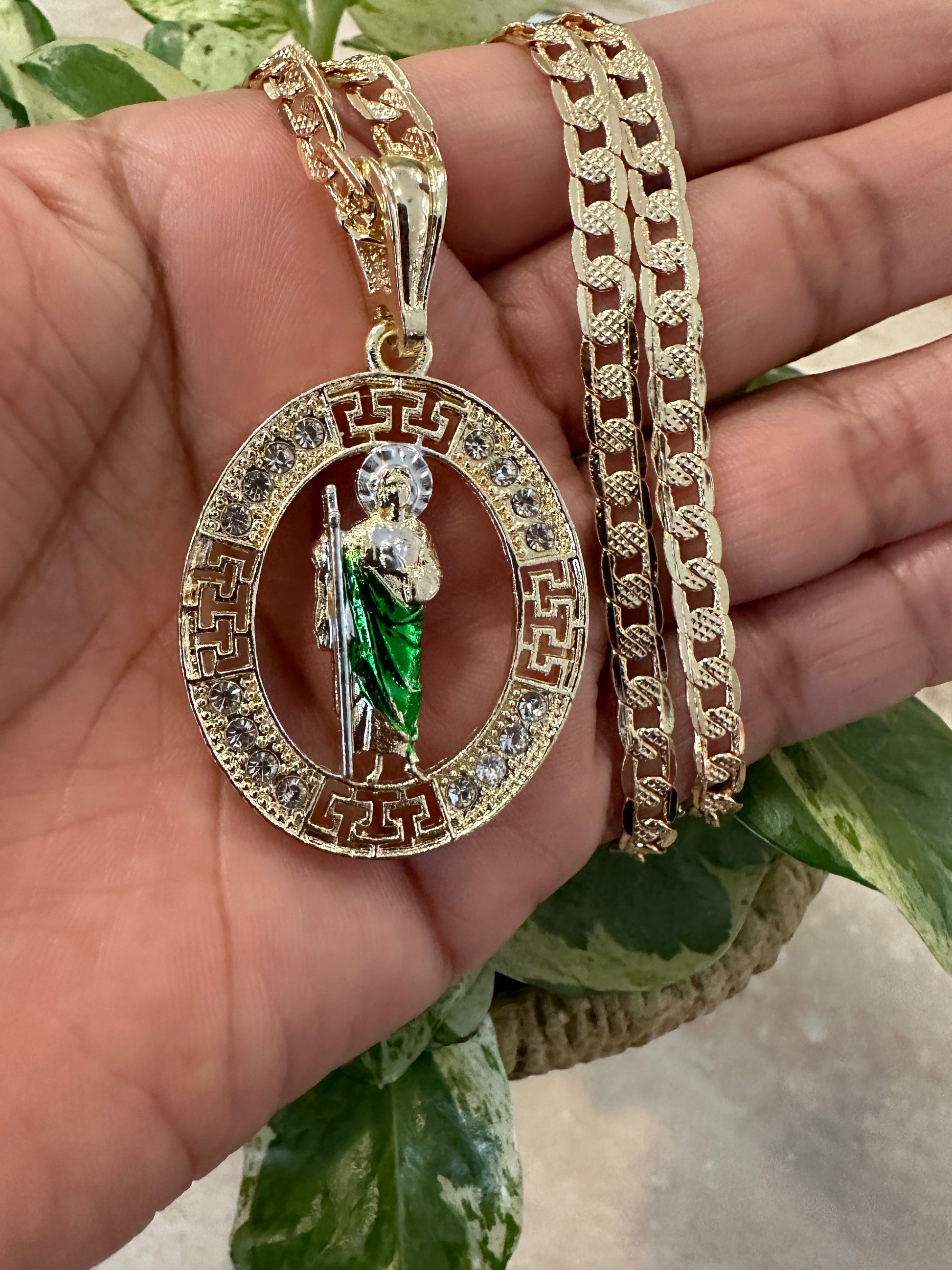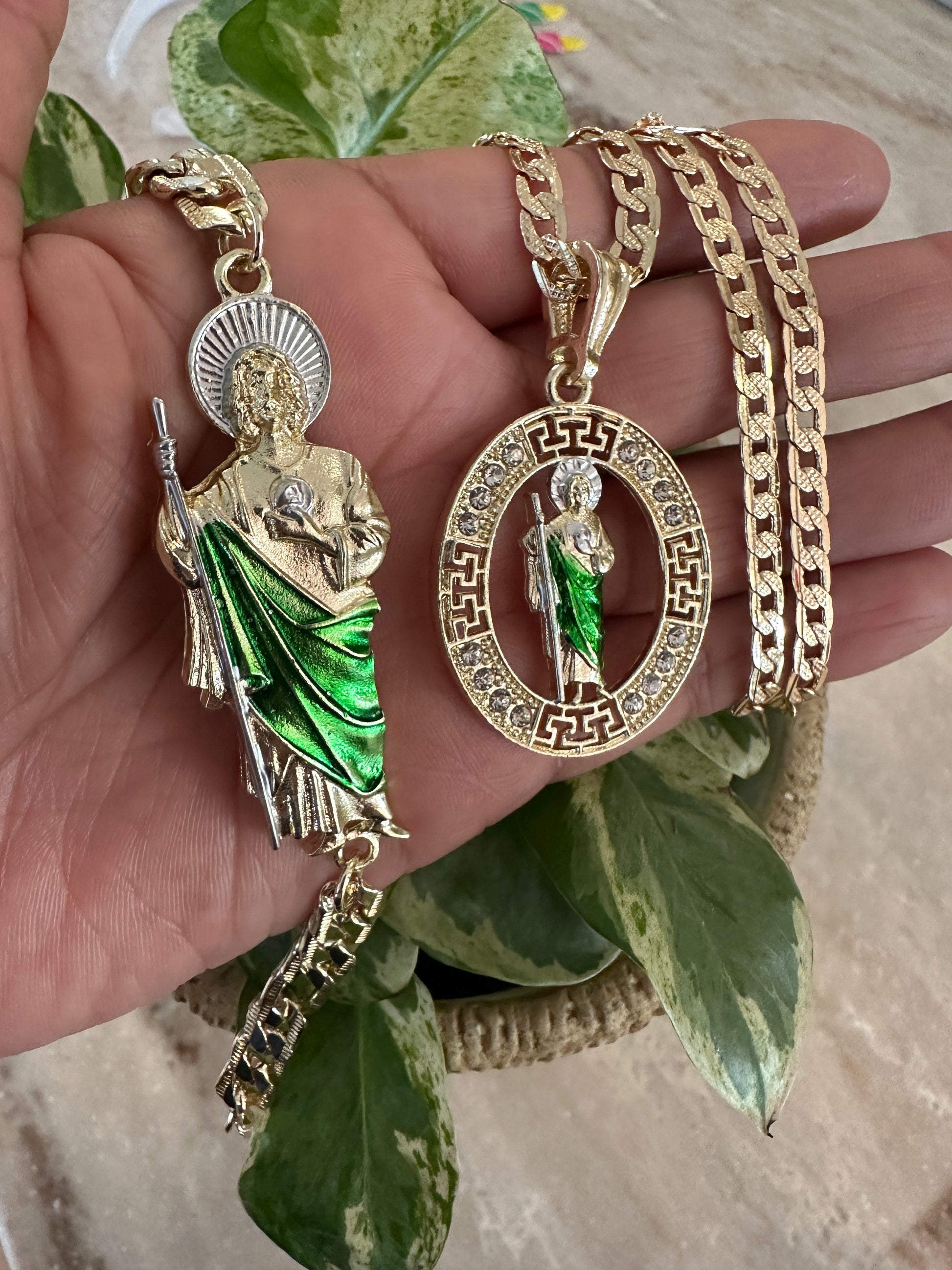 Enhance your style with the "Abundance" St Jude necklace and bracelet set. Made with a stunning 8" bracelet and 24" necklace, this beautiful set features a Cuban chain design. Show your support for St Jude with this elegant jewelry set.