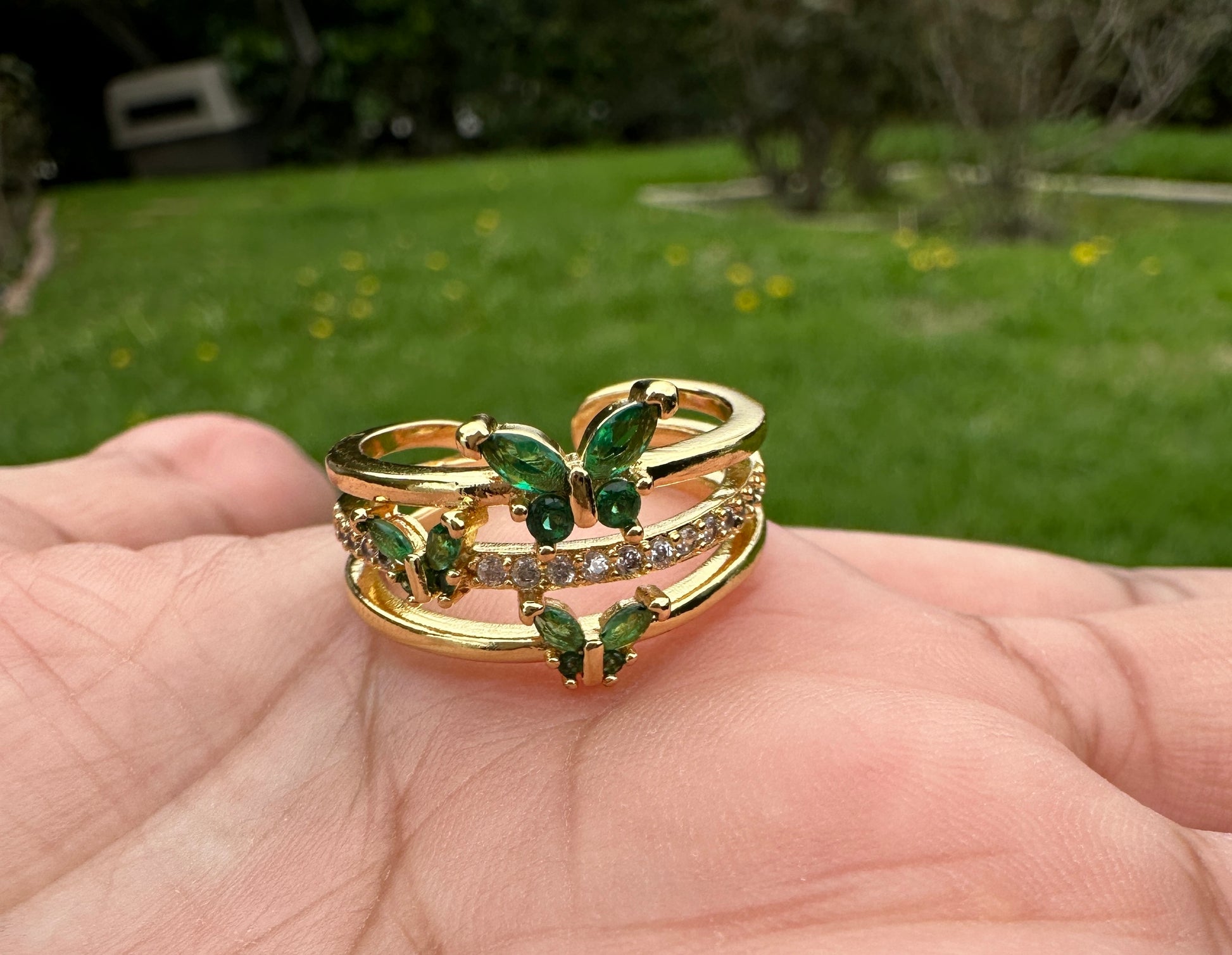 This "Butterflies" Ring is a charming addition to any jewelry collection. With its gold plating and cute green butterfly design, this adjustable ring is sure to add a touch of whimsy to any outfit. Perfect for butterfly lovers and fashion enthusiasts alike.