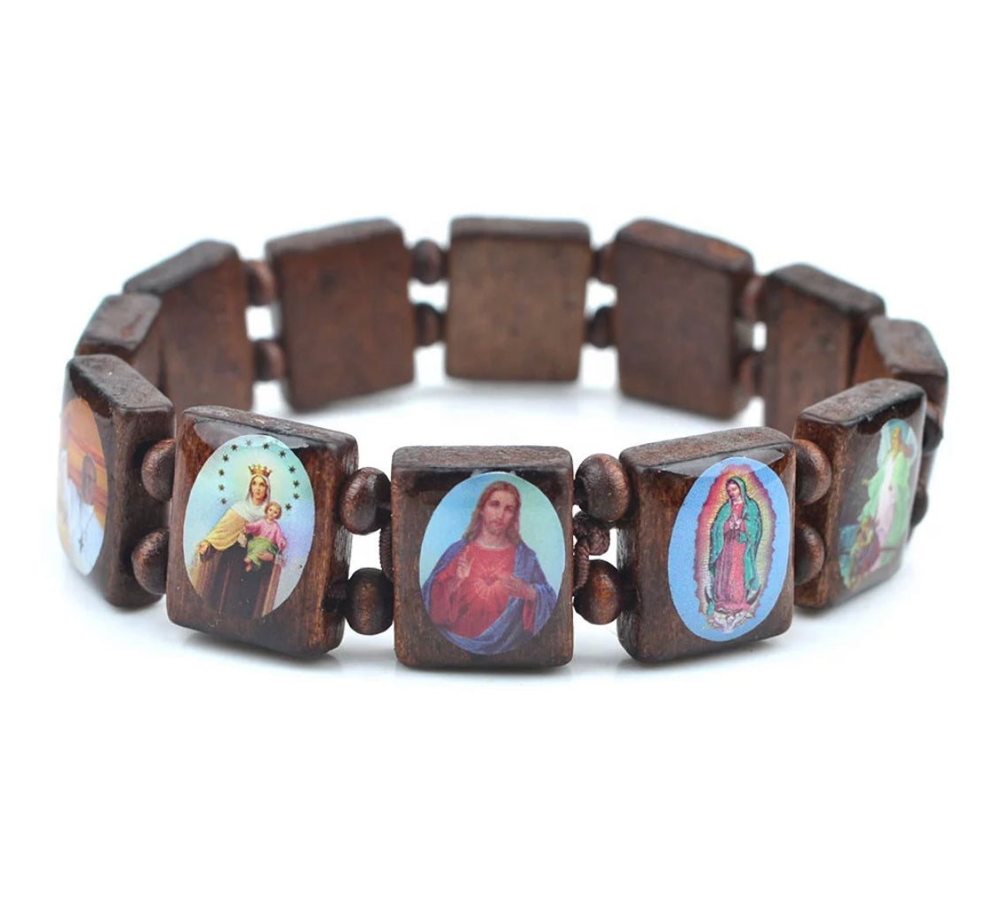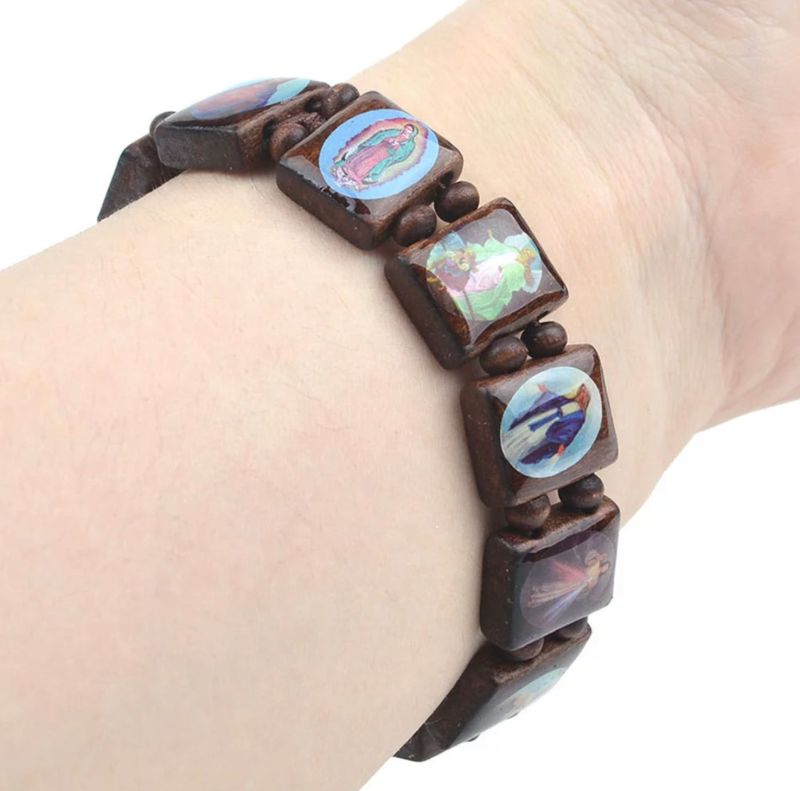 Catholic Square Wood Beads Rosary Bracelet With Holy Saints