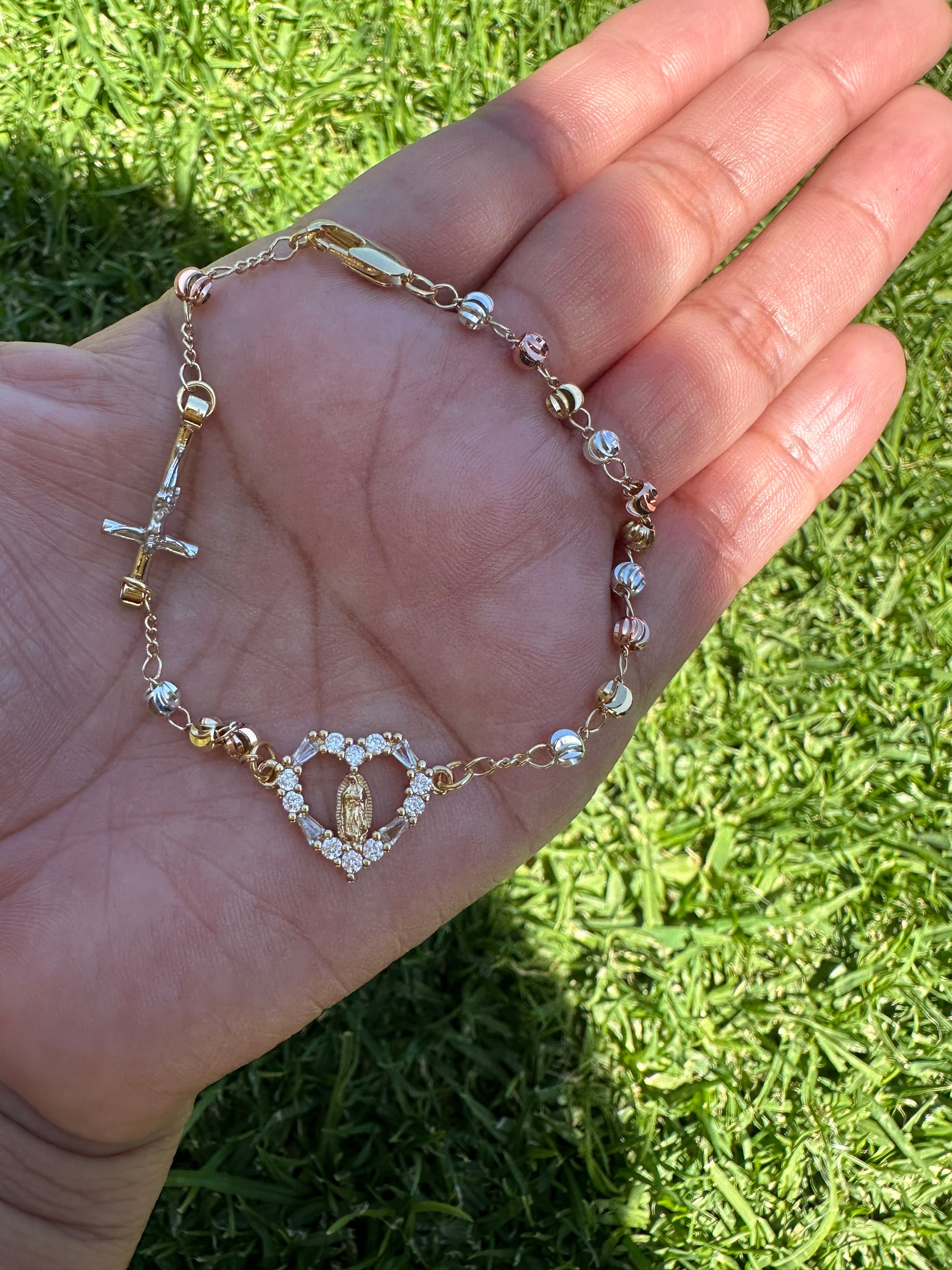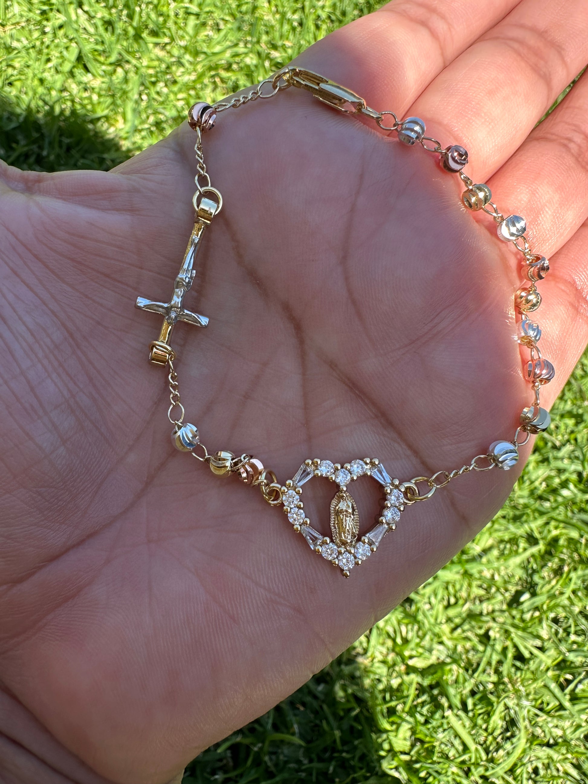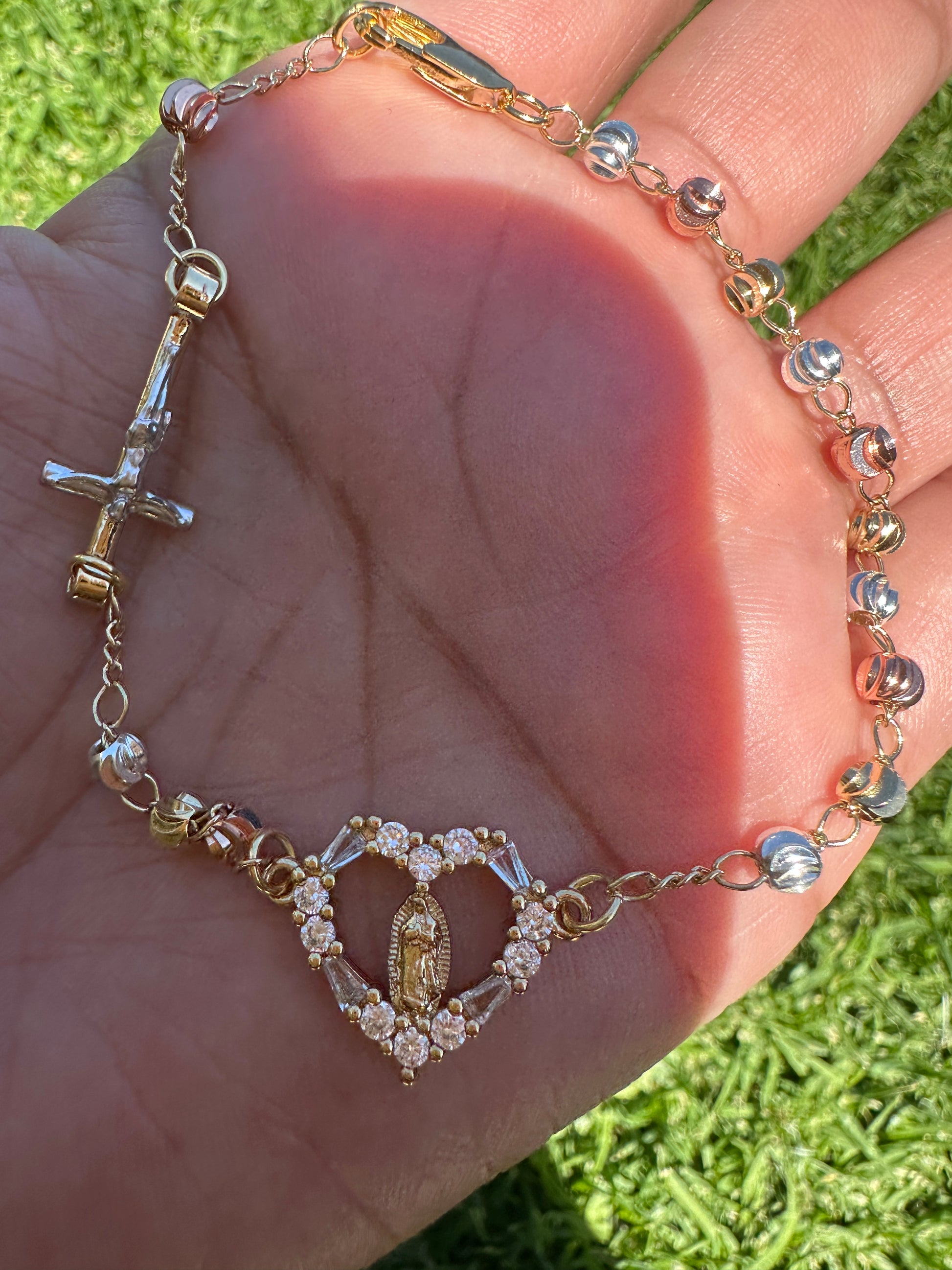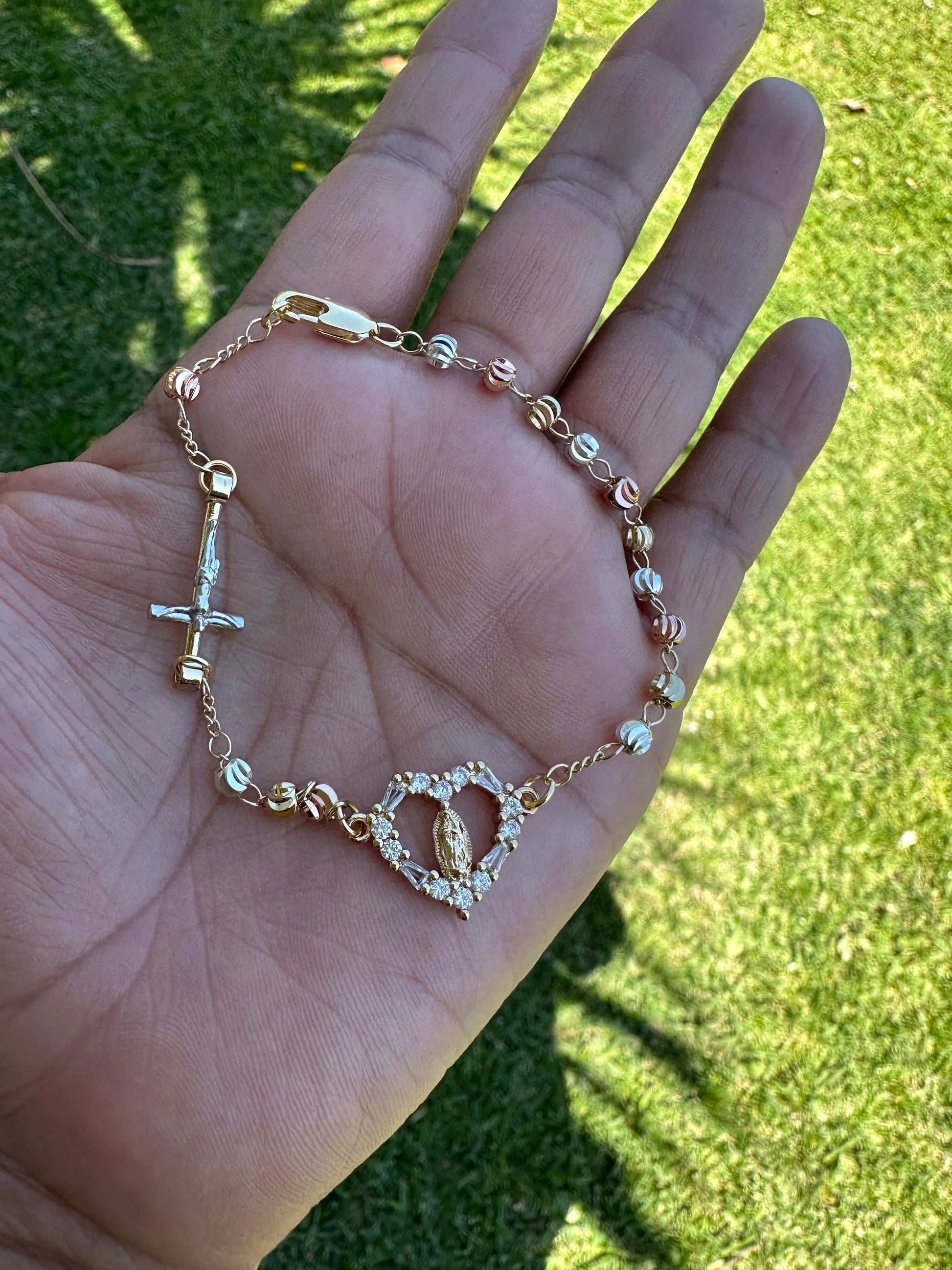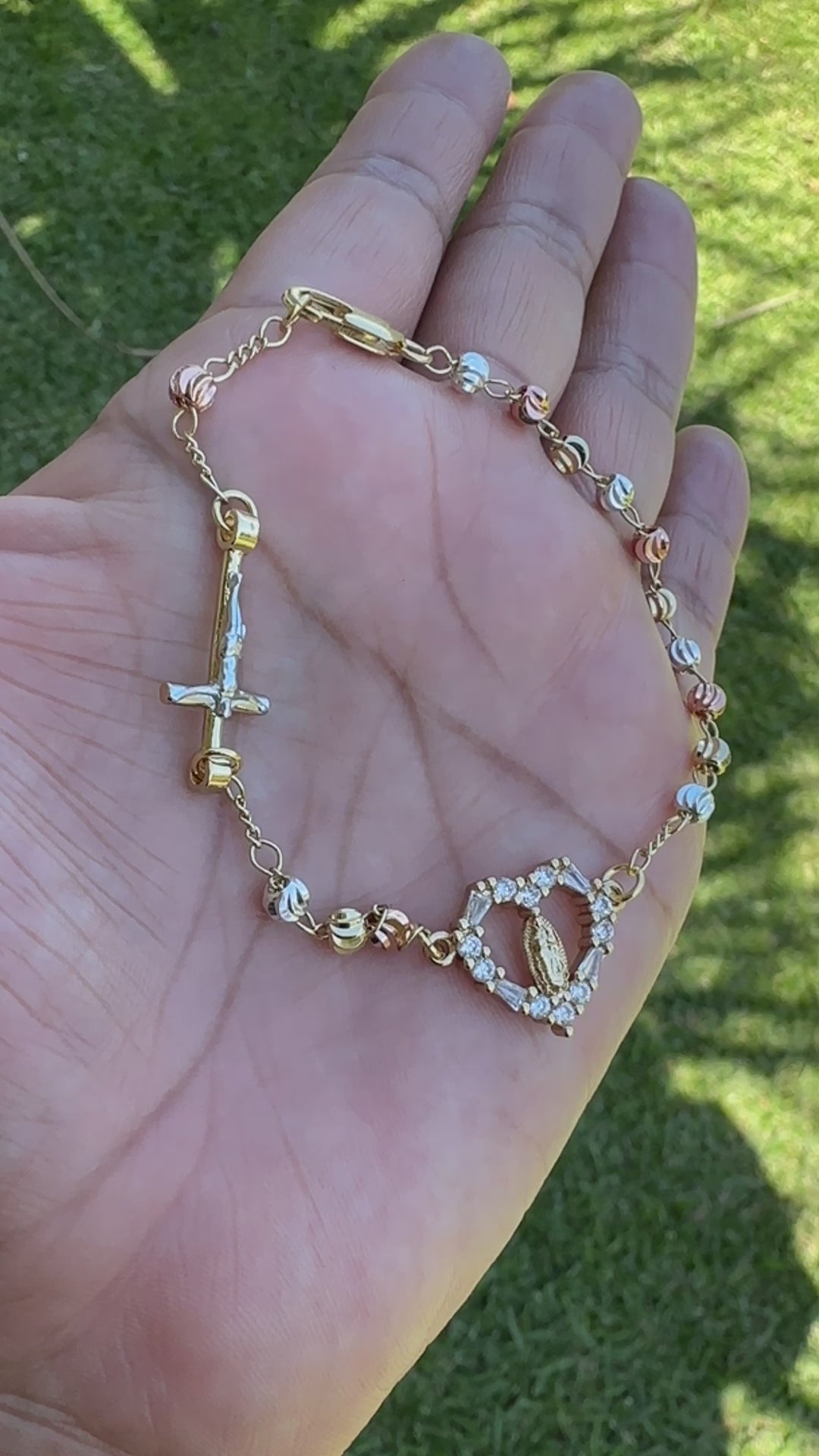 This beautifully crafted gold-plated bracelet combines the religious symbols of the cross and virgin, making it a meaningful and stylish accessory. The delicate design adds a touch of elegance to any outfit. Perfect for those seeking a unique and thoughtful piece of jewelry.