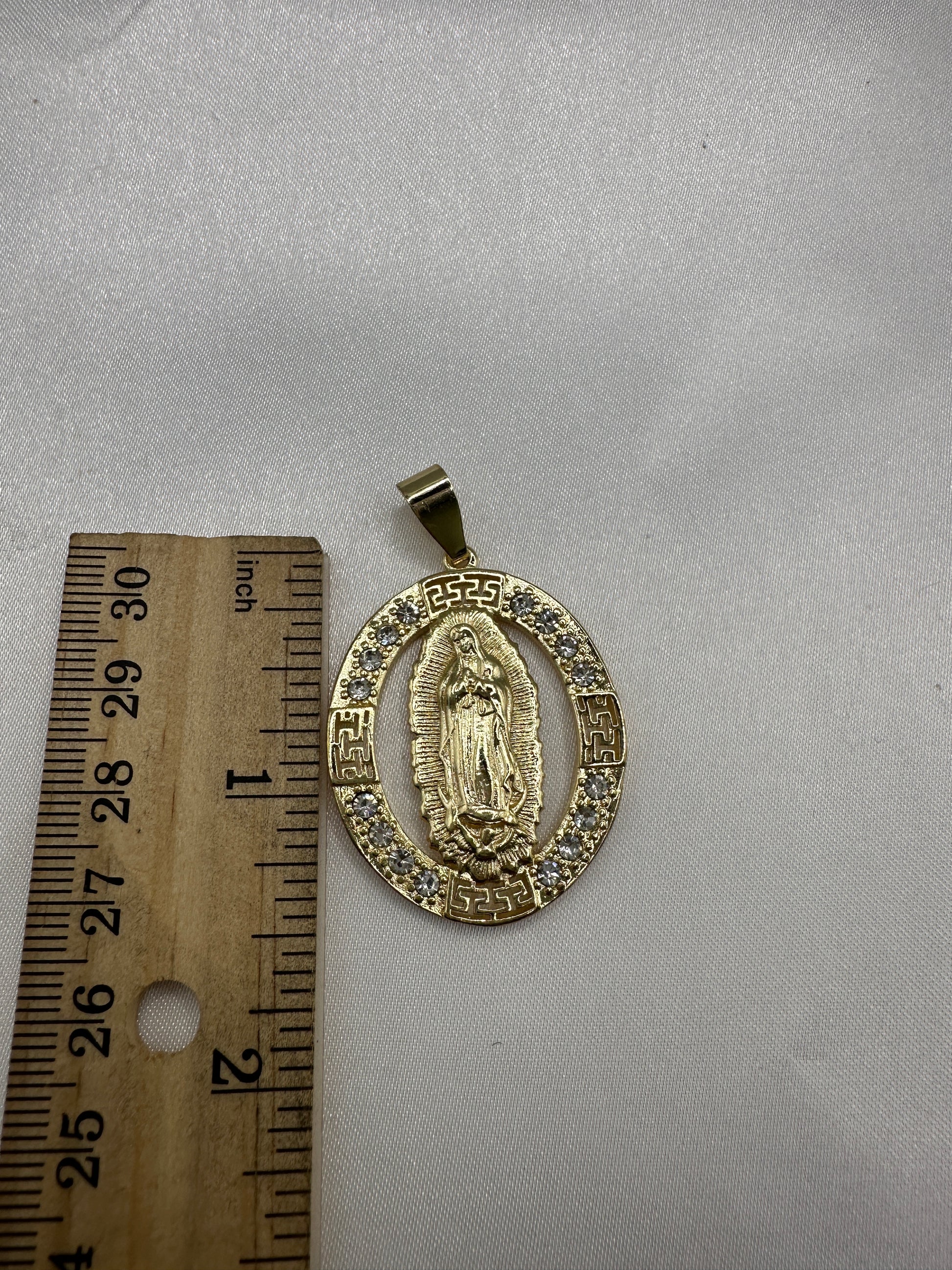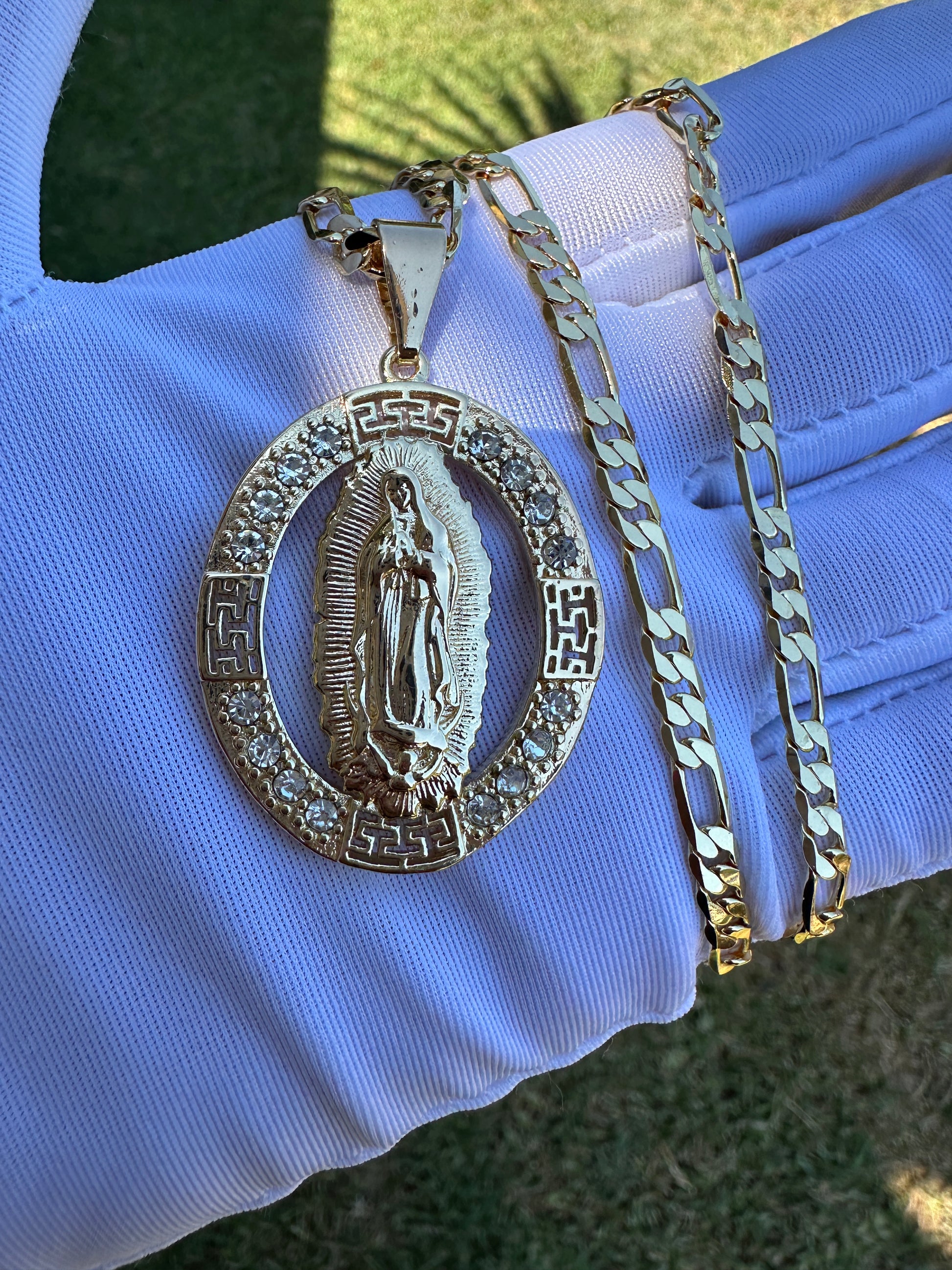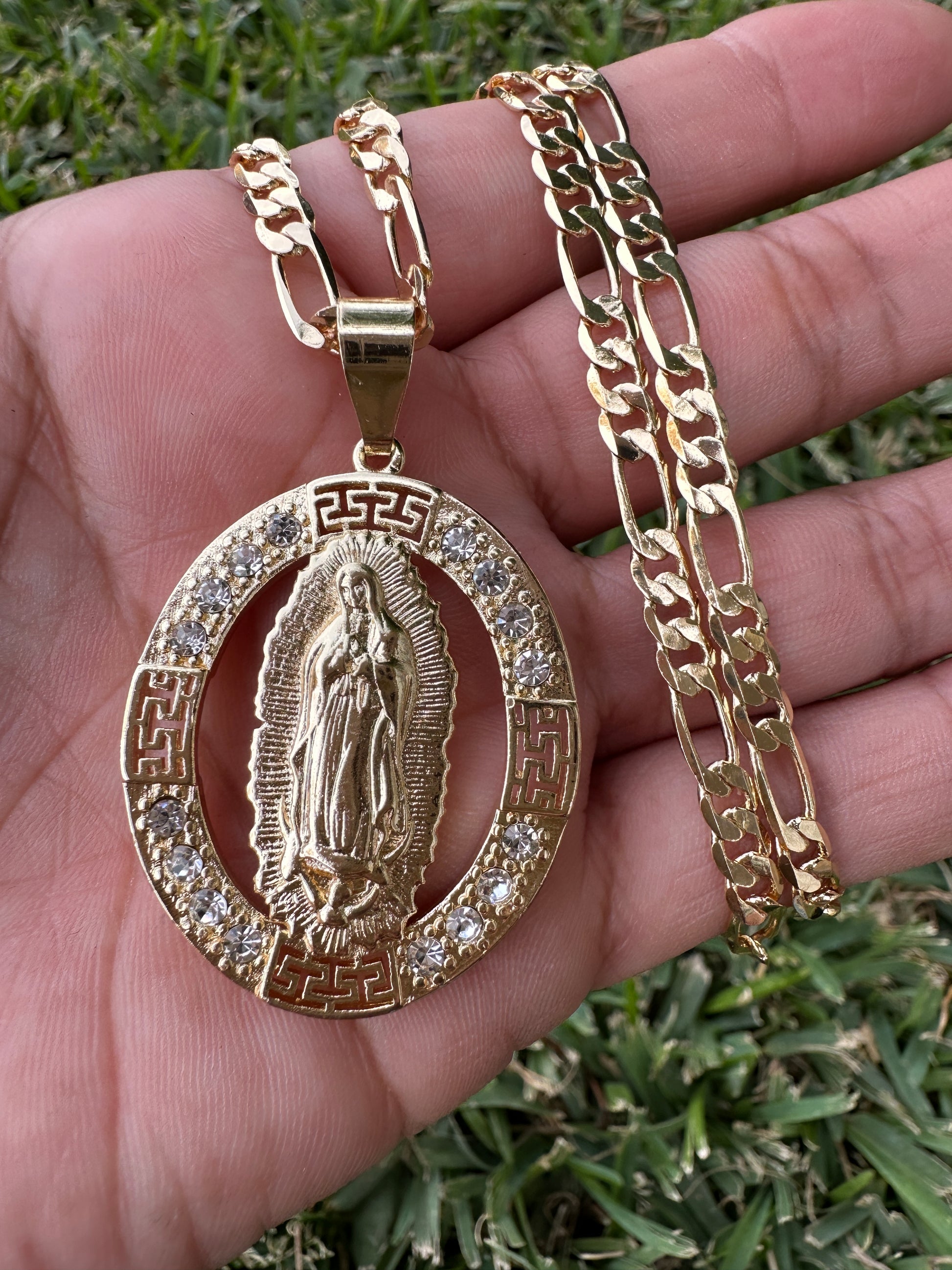 This Oval Virgin Necklace features a 24” Figaro Chain with a stunning Gold Plated pendant. The chain is tarnish-free, ensuring long-lasting shine. The Virgin Mary necklace is adorned with clear stones, making it a versatile and stylish addition to any outfit. Perfect for both him and her.