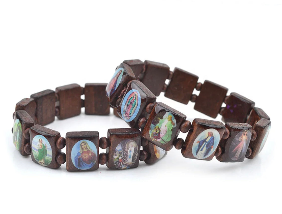 SAINT BEAD BRACELET Brown Wood Religious Icon Catholic Stretch Elastic