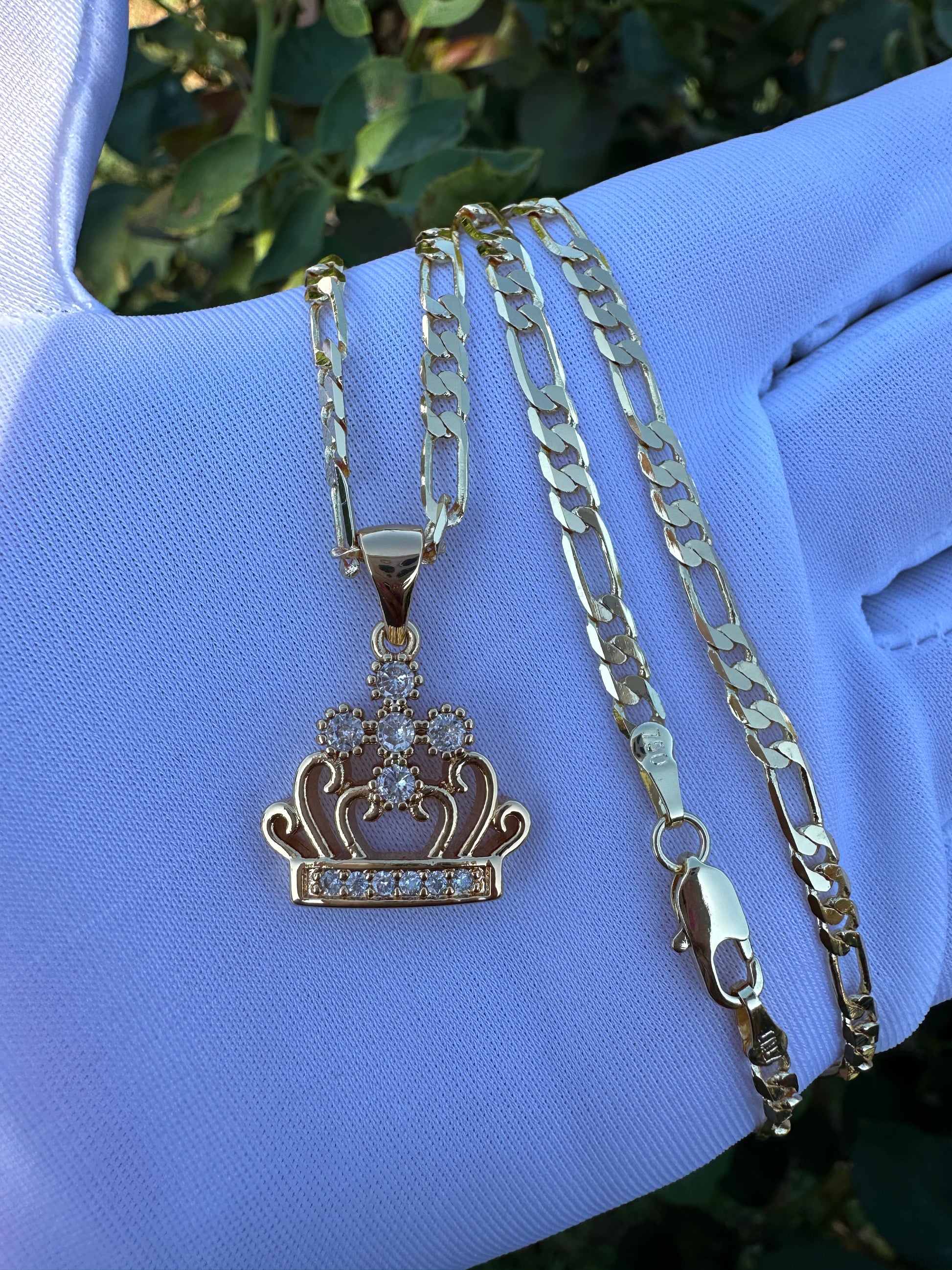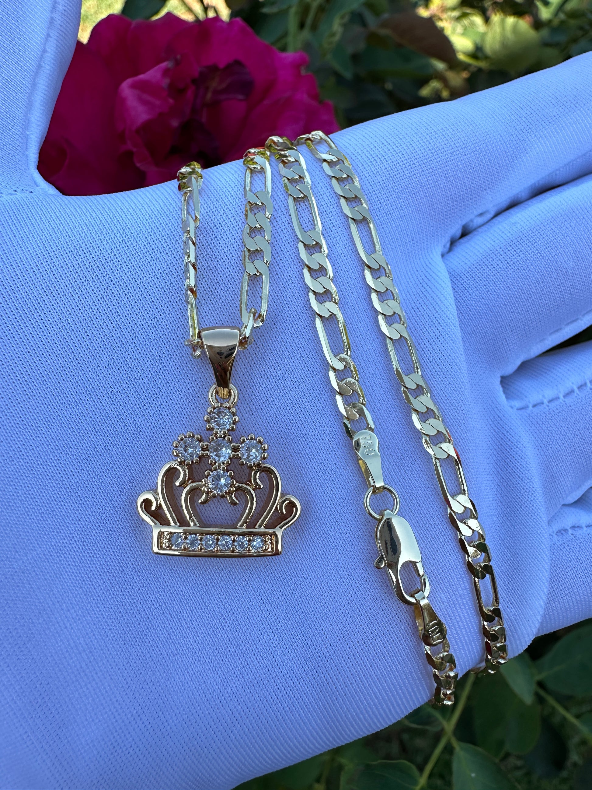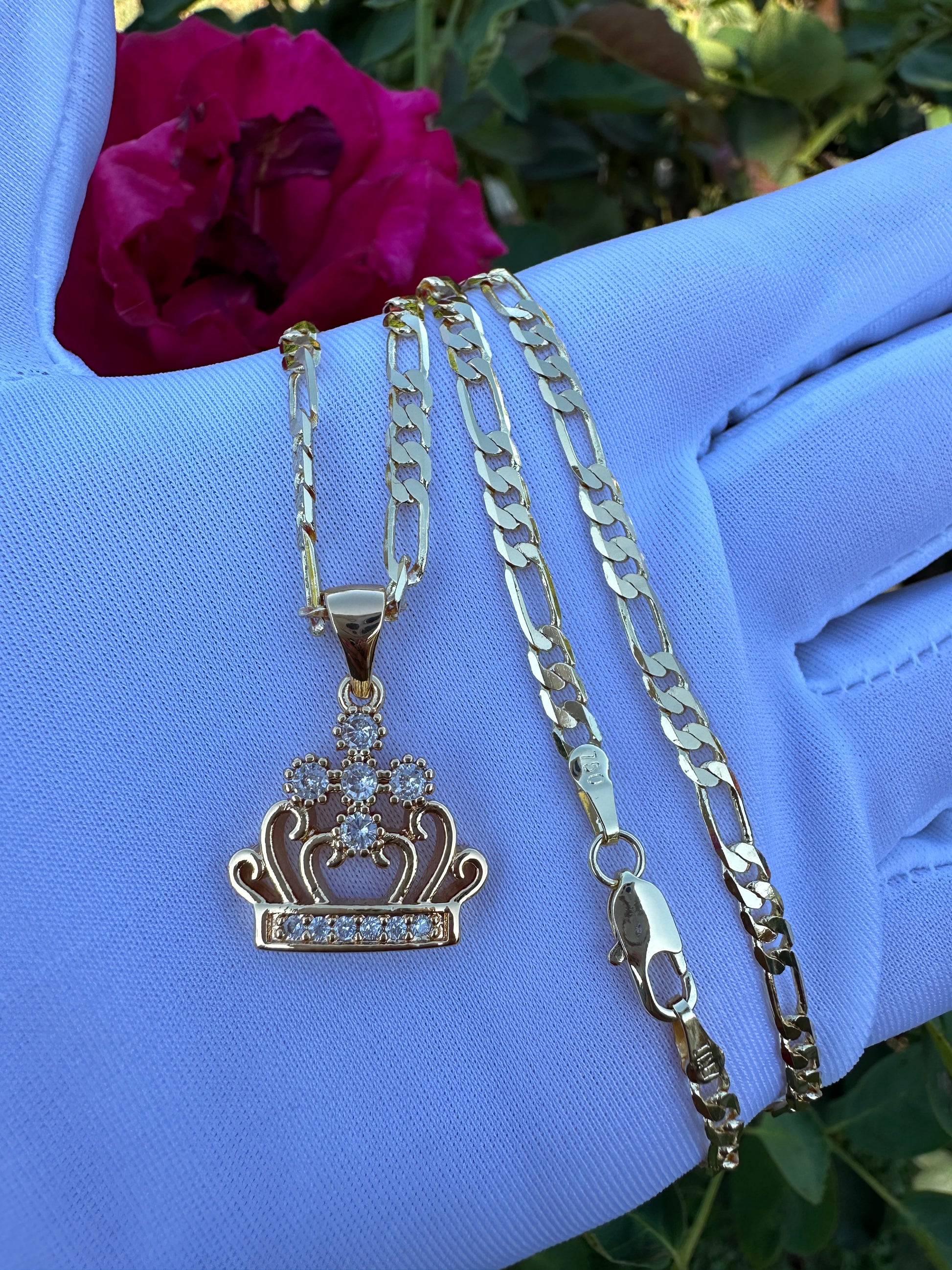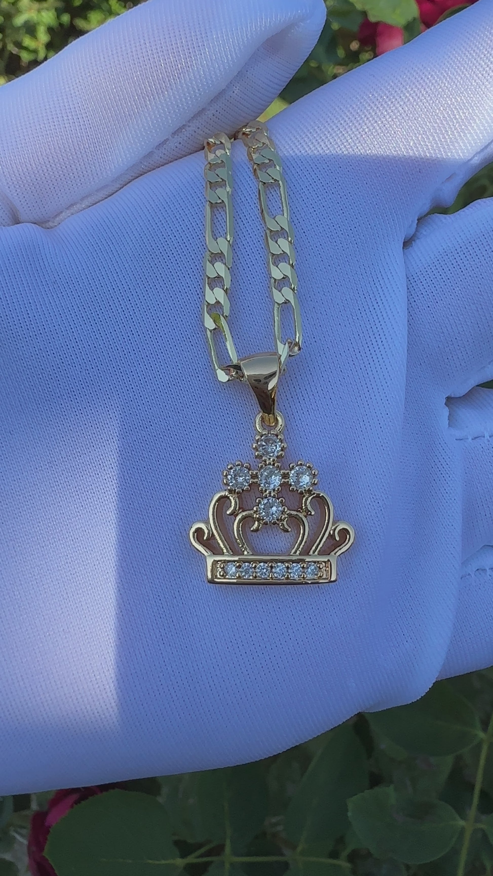 This gold-plated Crown Cross Necklace features a 20” inch Figaro chain and a stunning crown pendant. The chain allows for comfort and style, while the crown pendant adds a regal touch to any outfit. Elevate your look with this elegant and fashionable necklace.
