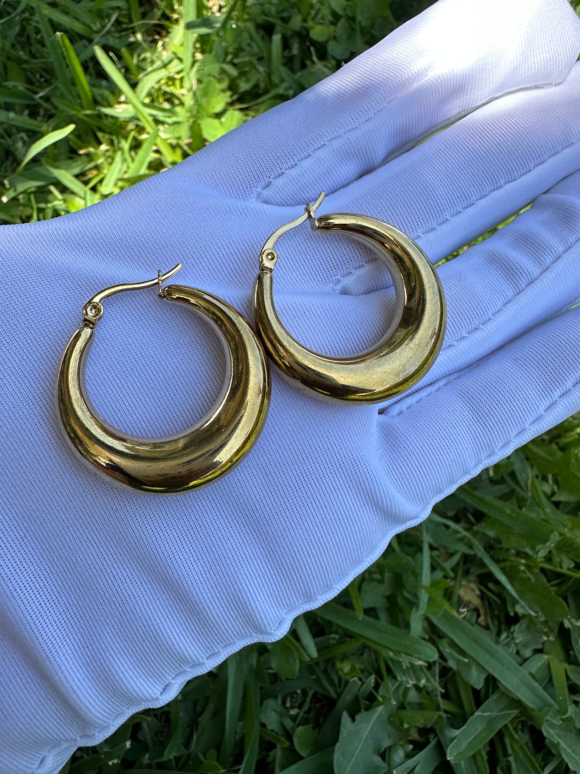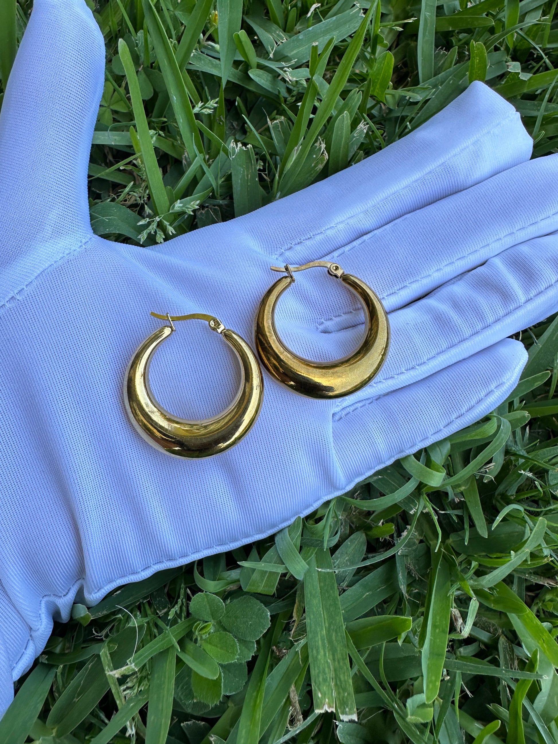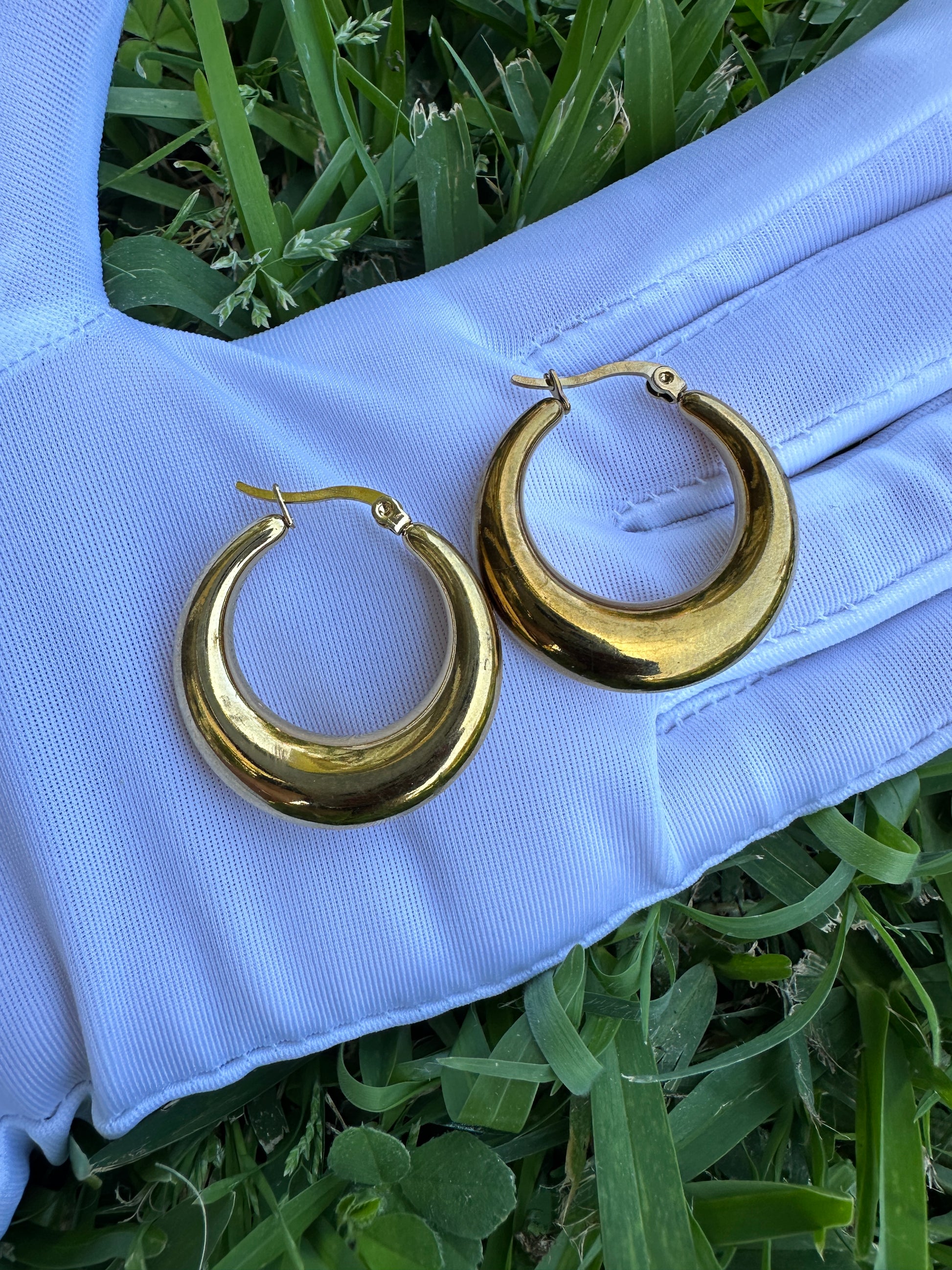 "These gold-plated hoop earrings offer a stylishly cute addition to any outfit. With a thicker design, these earrings offer a bolder look while remaining versatile enough for any occasion. Elevate your style with these trendy earrings."