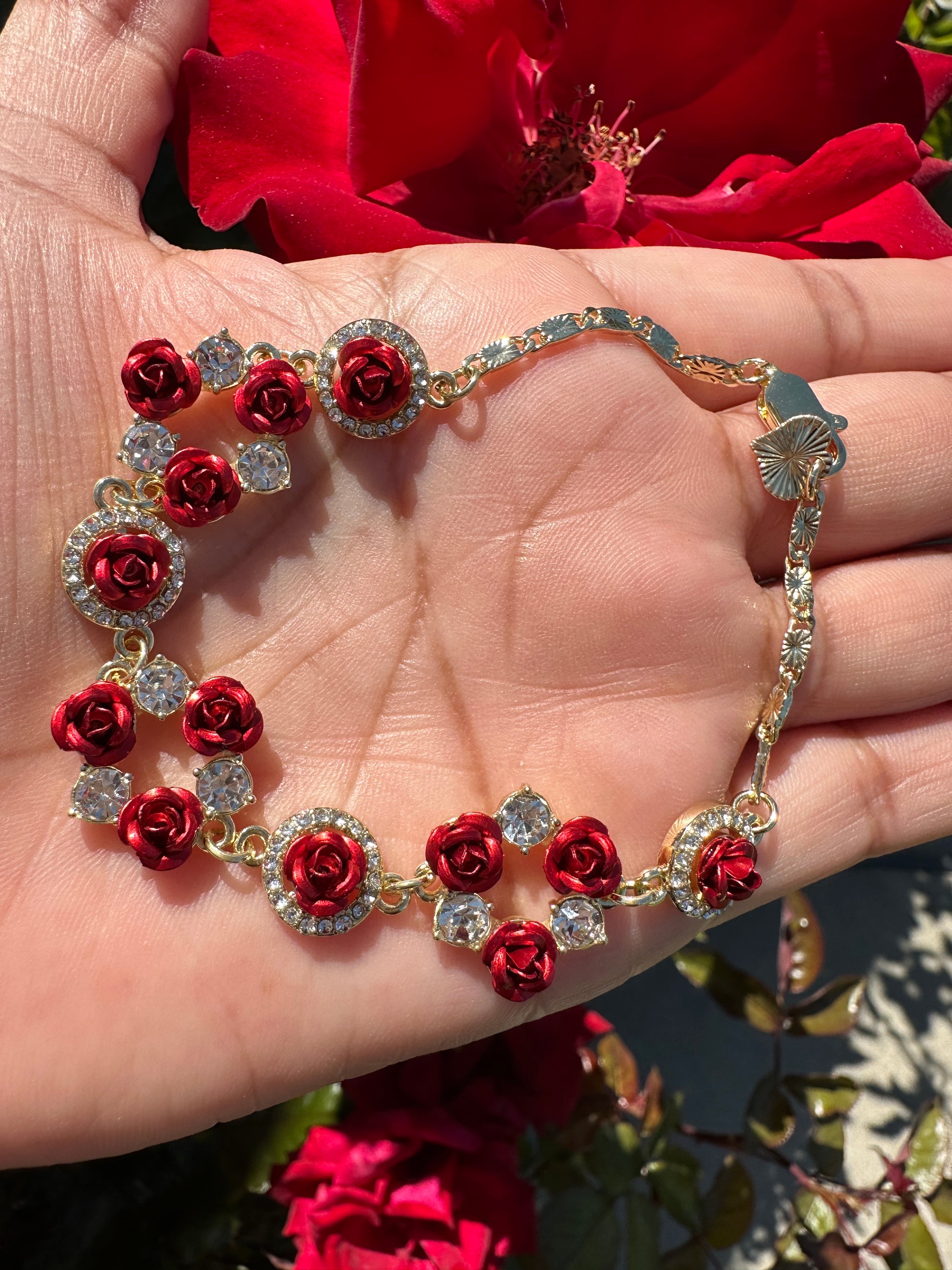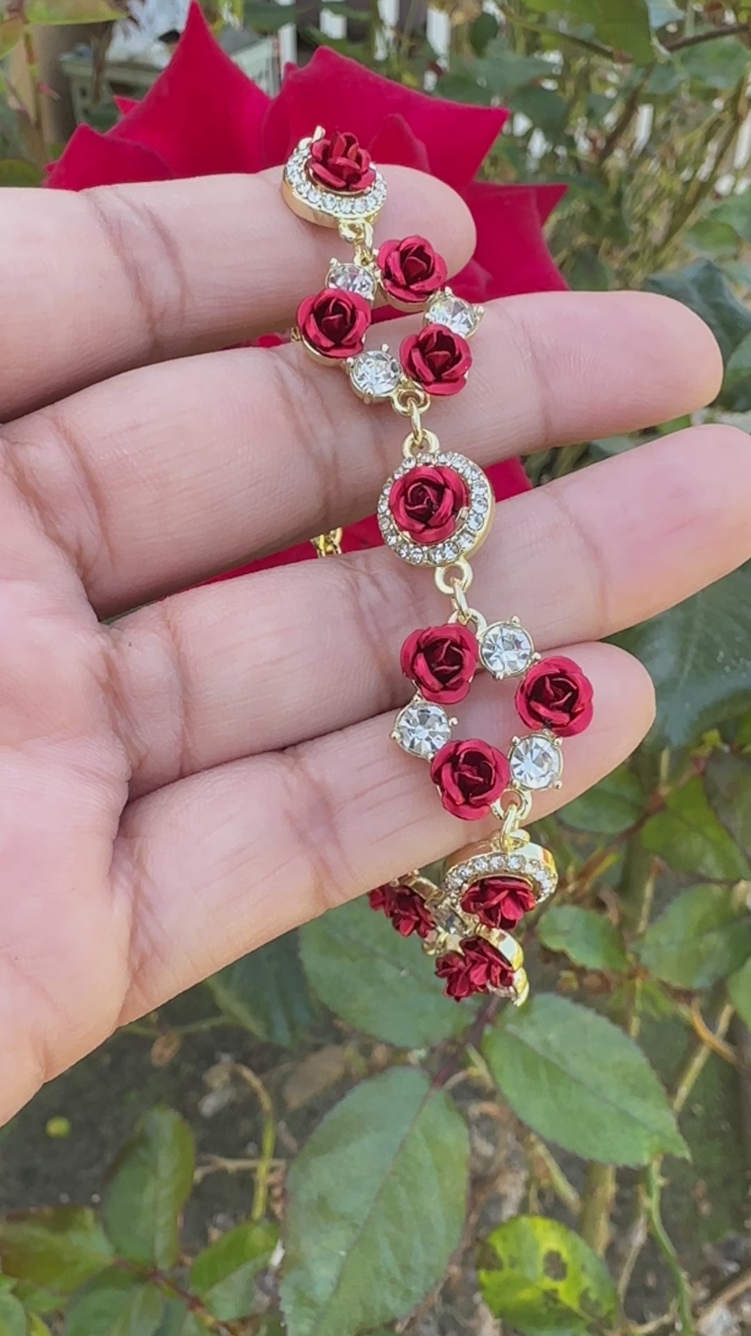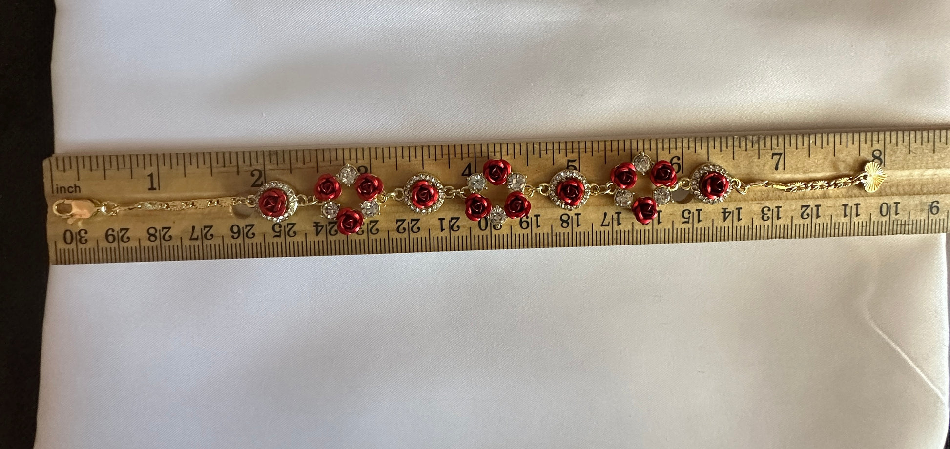 This 8" red roses bracelet is a unique and beautiful gold plated piece for her or him. The intricate design adds an elegant touch to any outfit, making it a perfect accessory for day or evening wear. With its striking gold plating, this bracelet is sure to catch the eye of anyone who sees it.