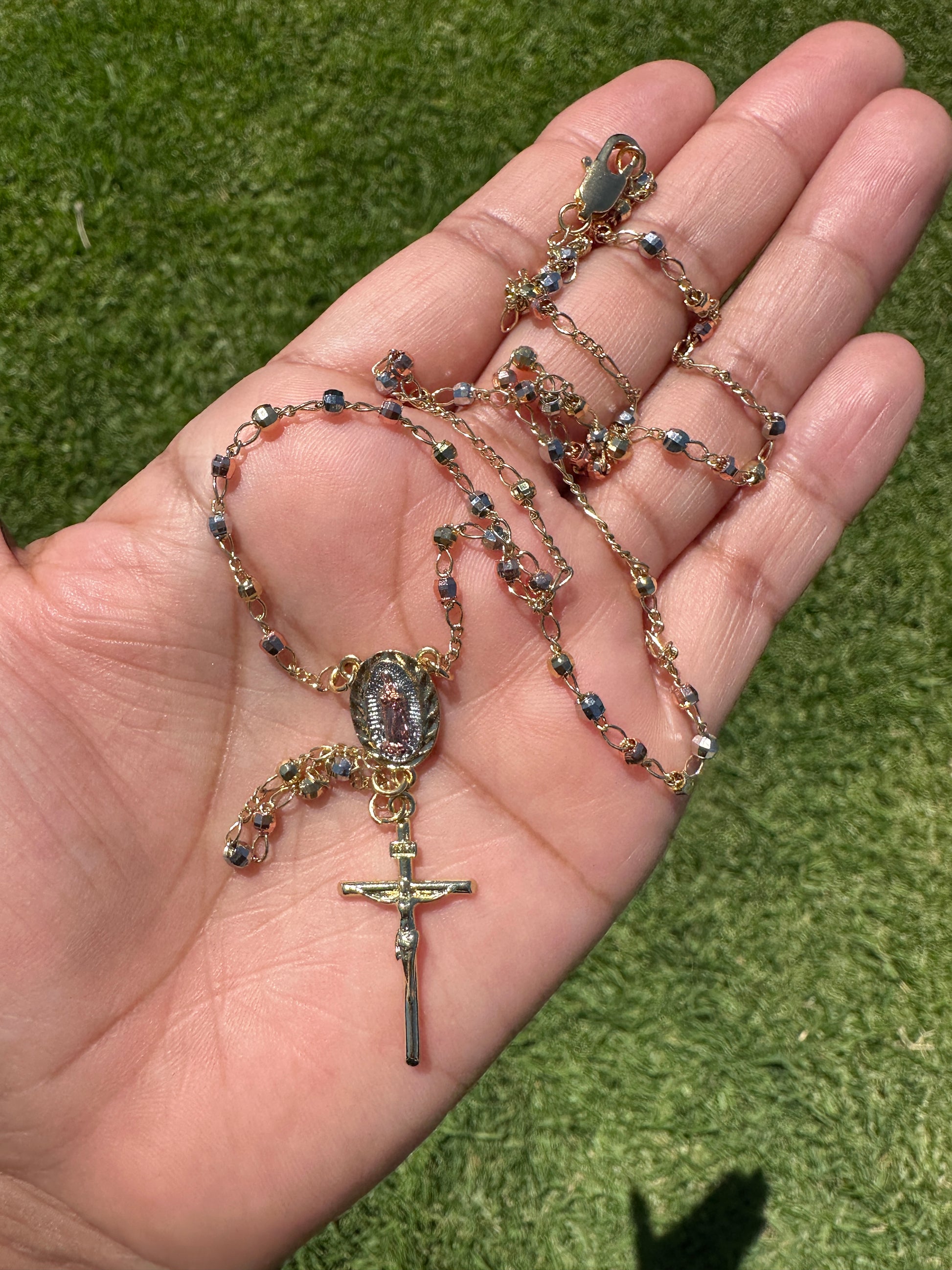 This gorgeous 20" rosary necklace features a tricolor design, with a gold plated finish that has been plated 5 times for long lasting shine. Complete with a cross and Virgin pendant, this necklace is a beautiful representation of faith and style.
