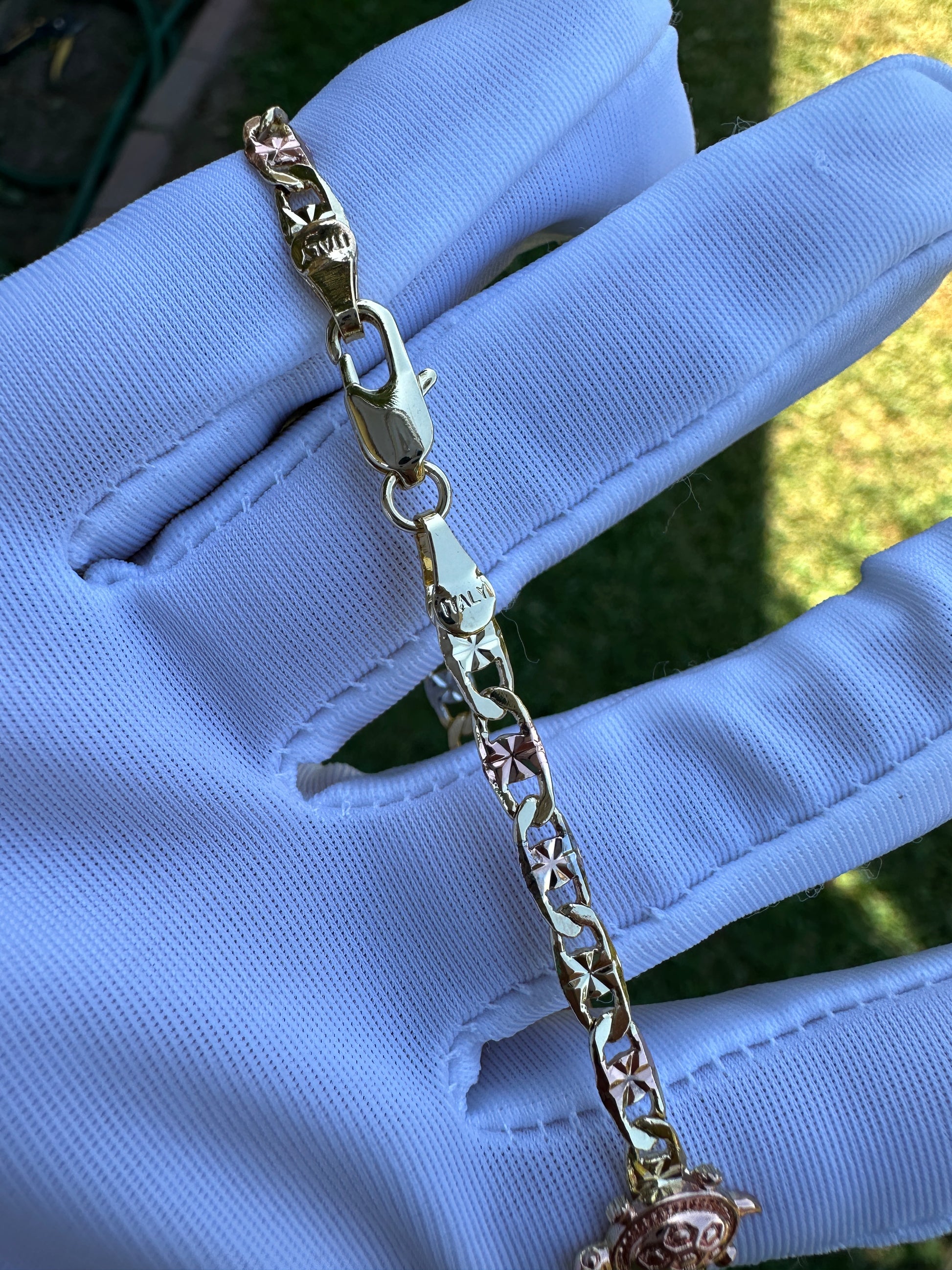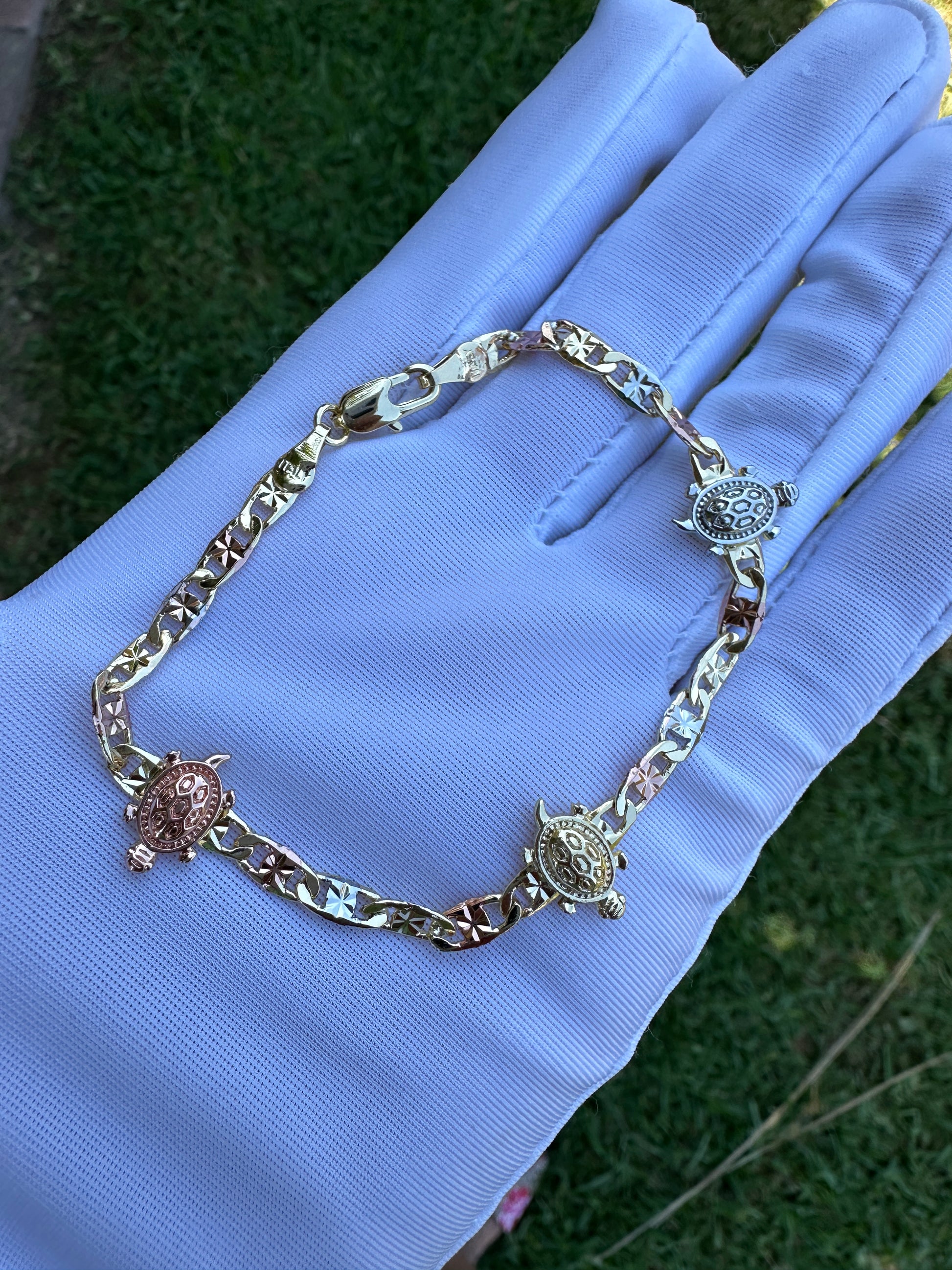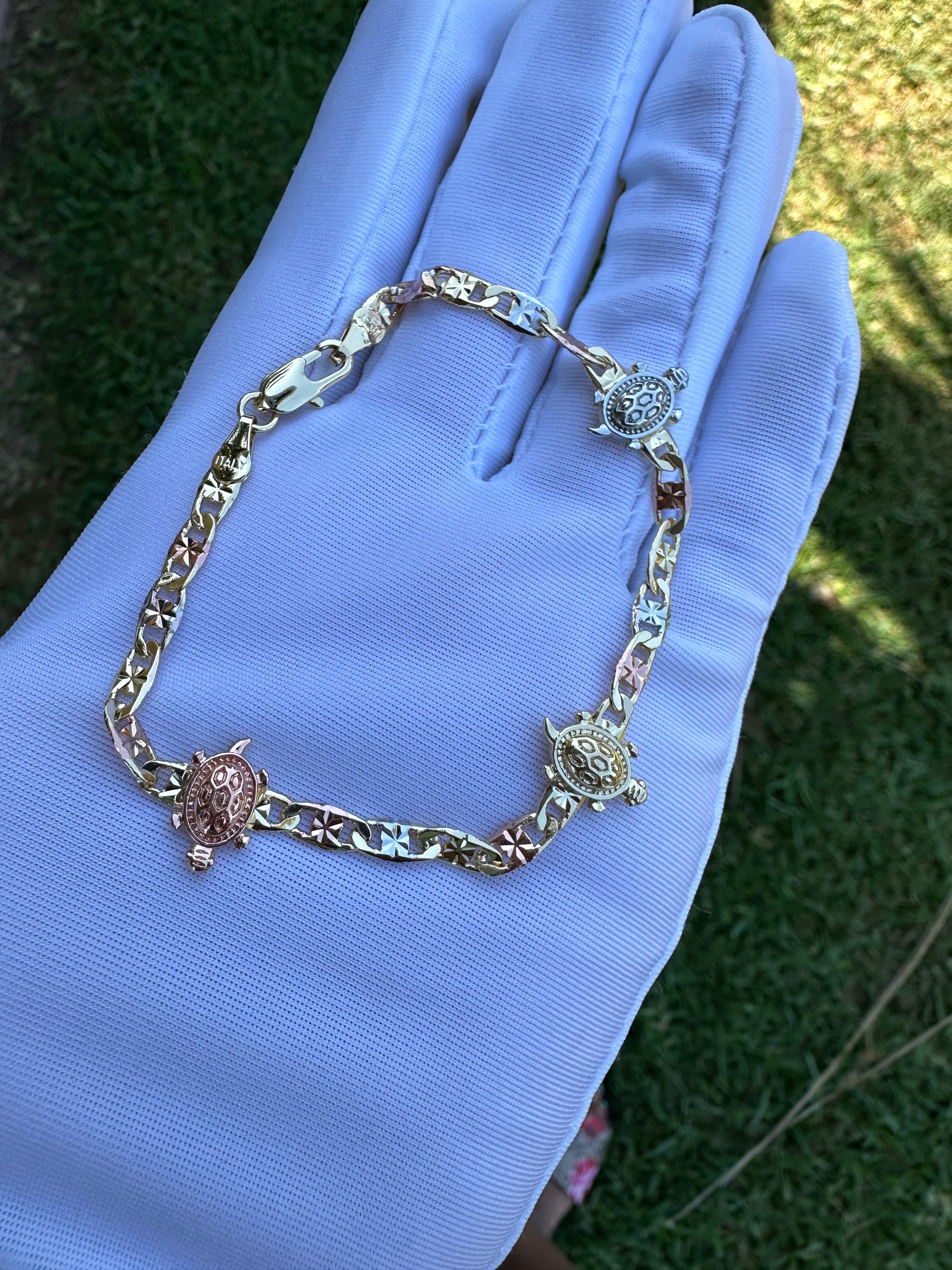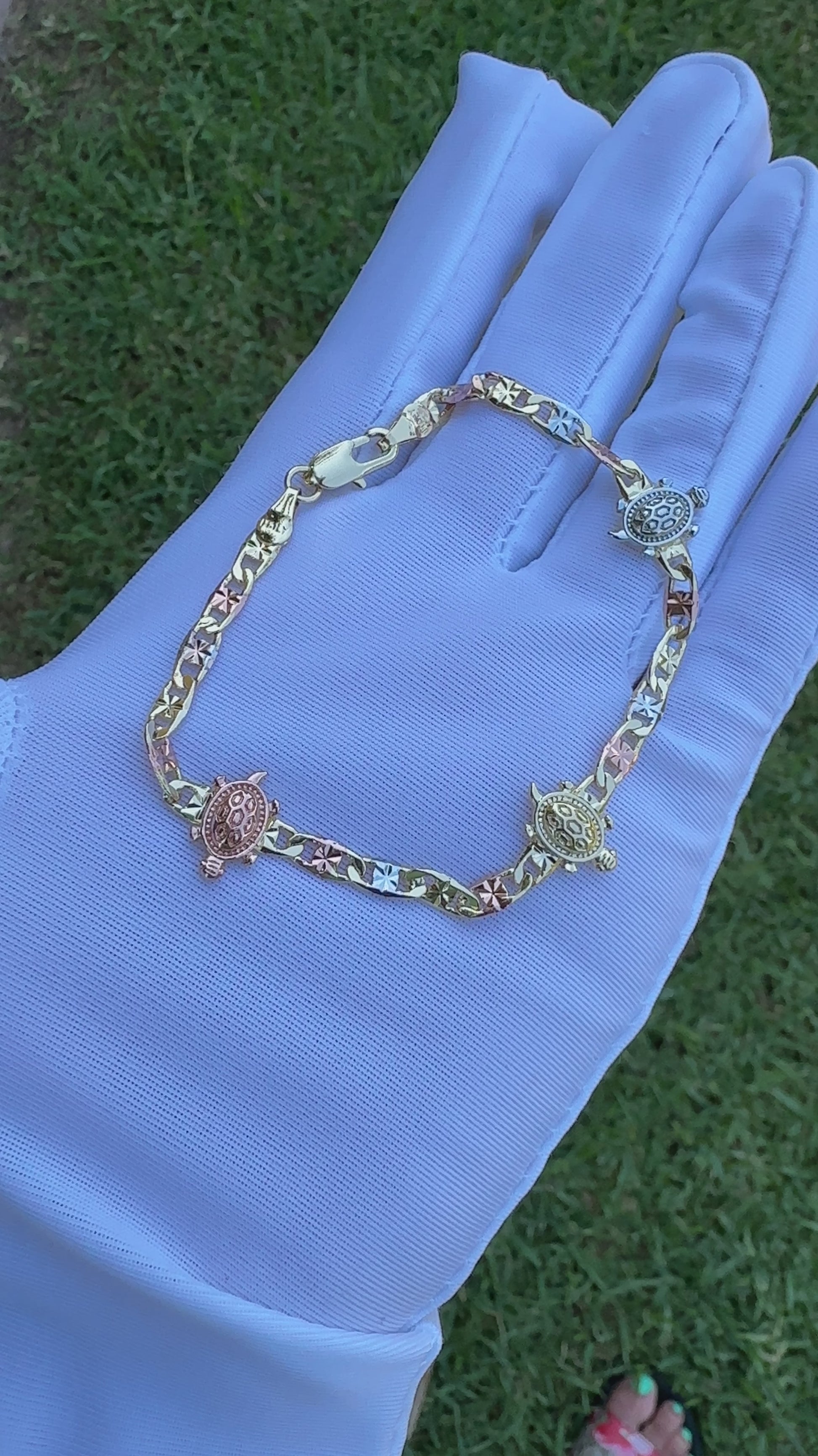 This Turtle Wealth Bracelet combines the ancient symbol of the turtle, known for bringing good luck and wealth, with modern elegance. Crafted with a tricolor of gold plating, this 7" long bracelet is perfect for him or her. Enhance your daily style and potential prosperity with this unique piece.